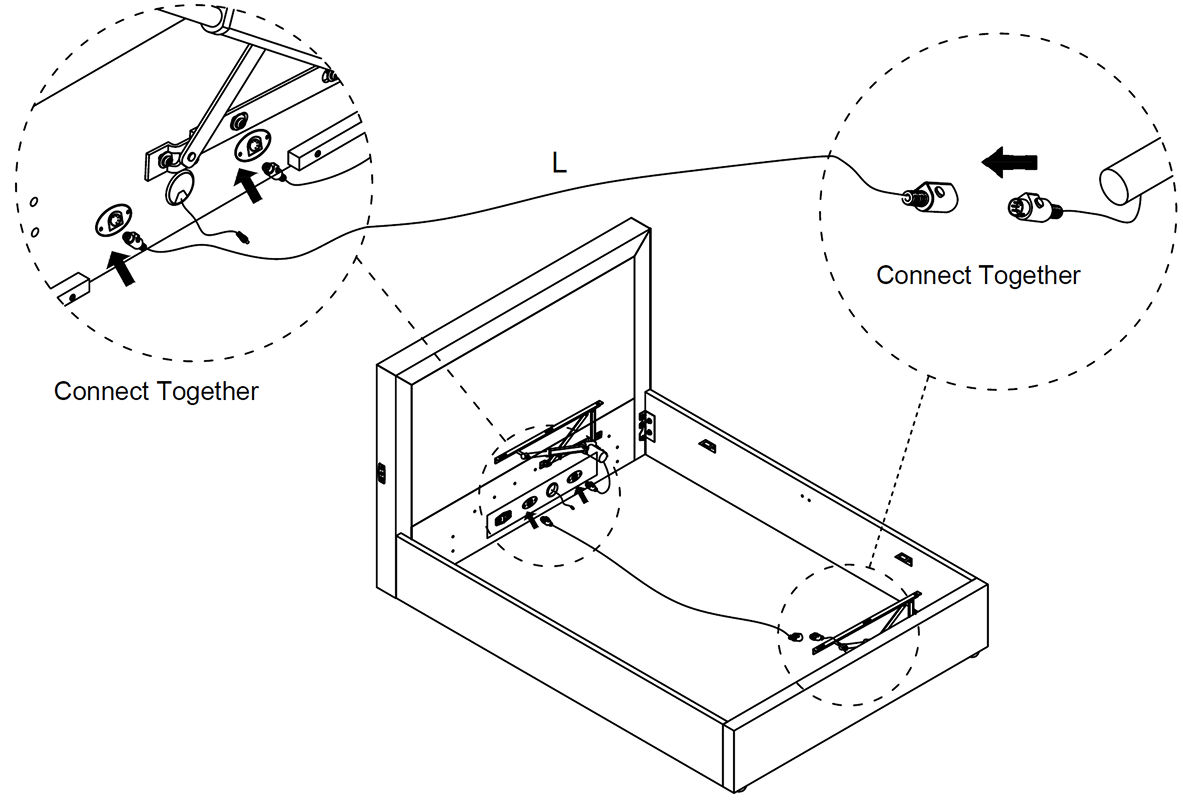 - Locate the Long Connection Cable (L) coming from the lift mechanism at the headboard end.