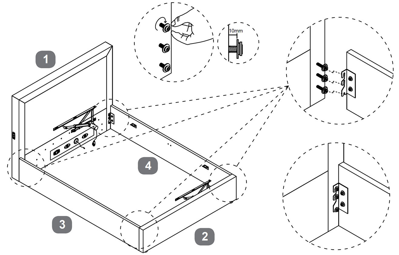 - Attach the Side Rail - RH (3) and Side Rail - LH (4) to the Headboard (1) and Footboard (2) using the corner hook brackets already fitted.