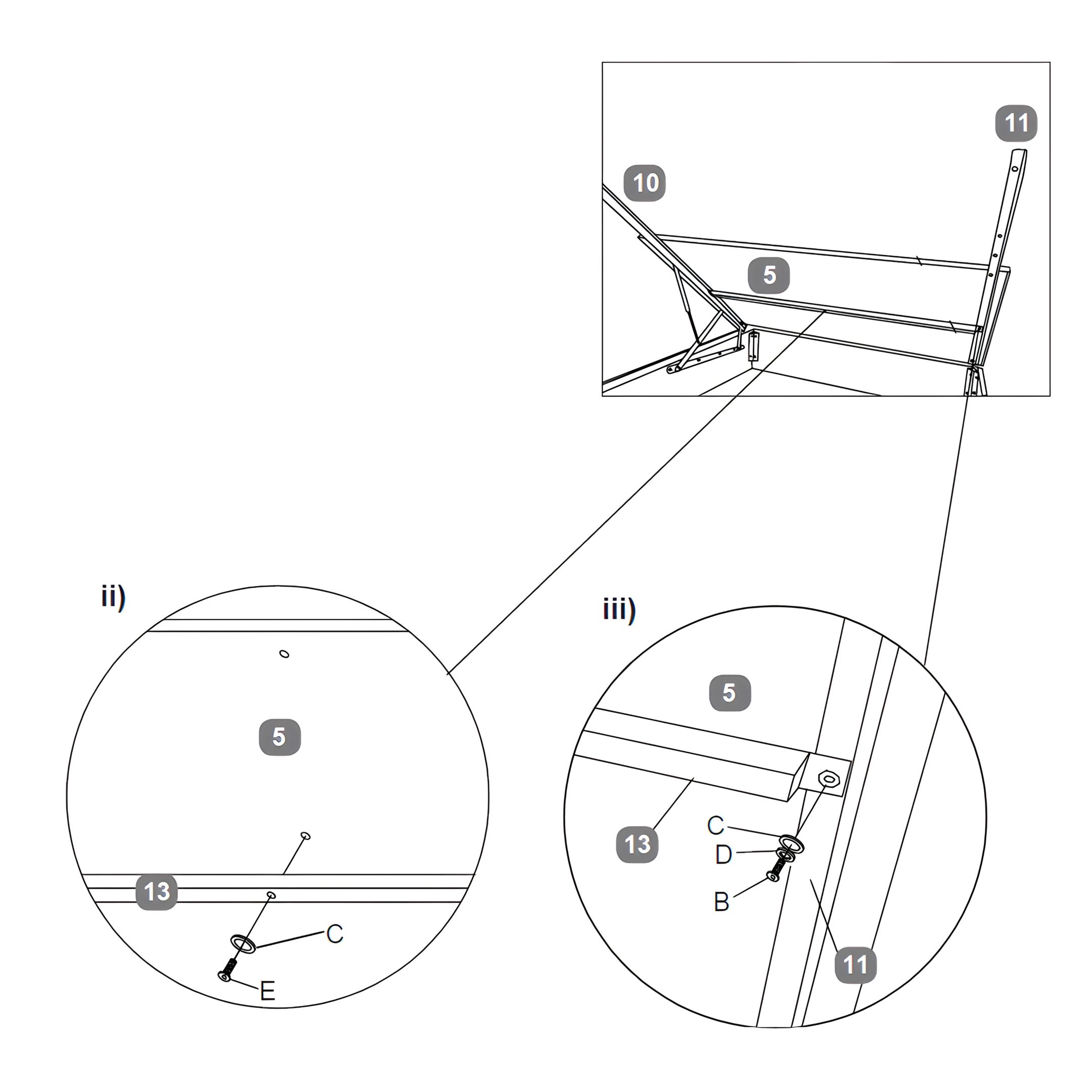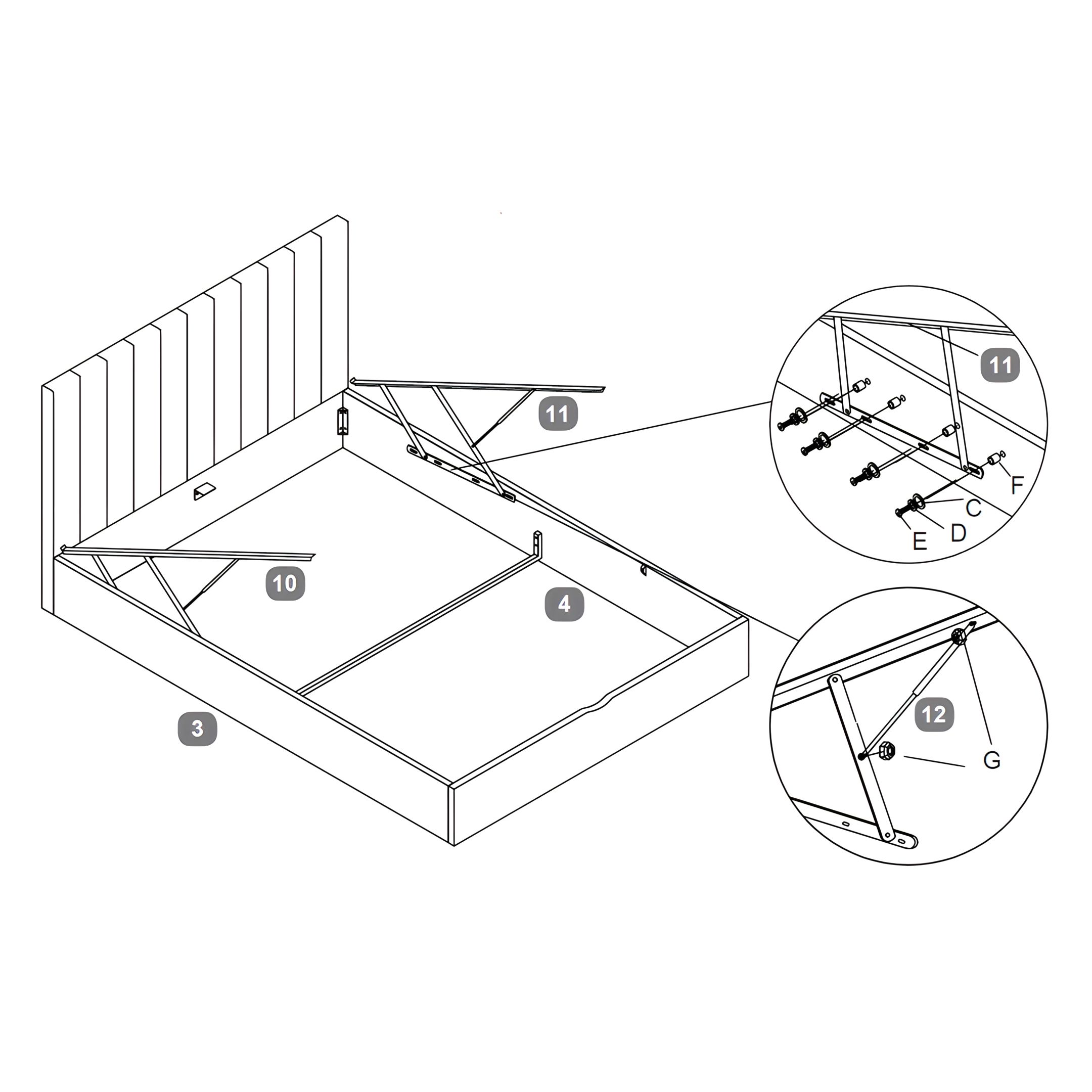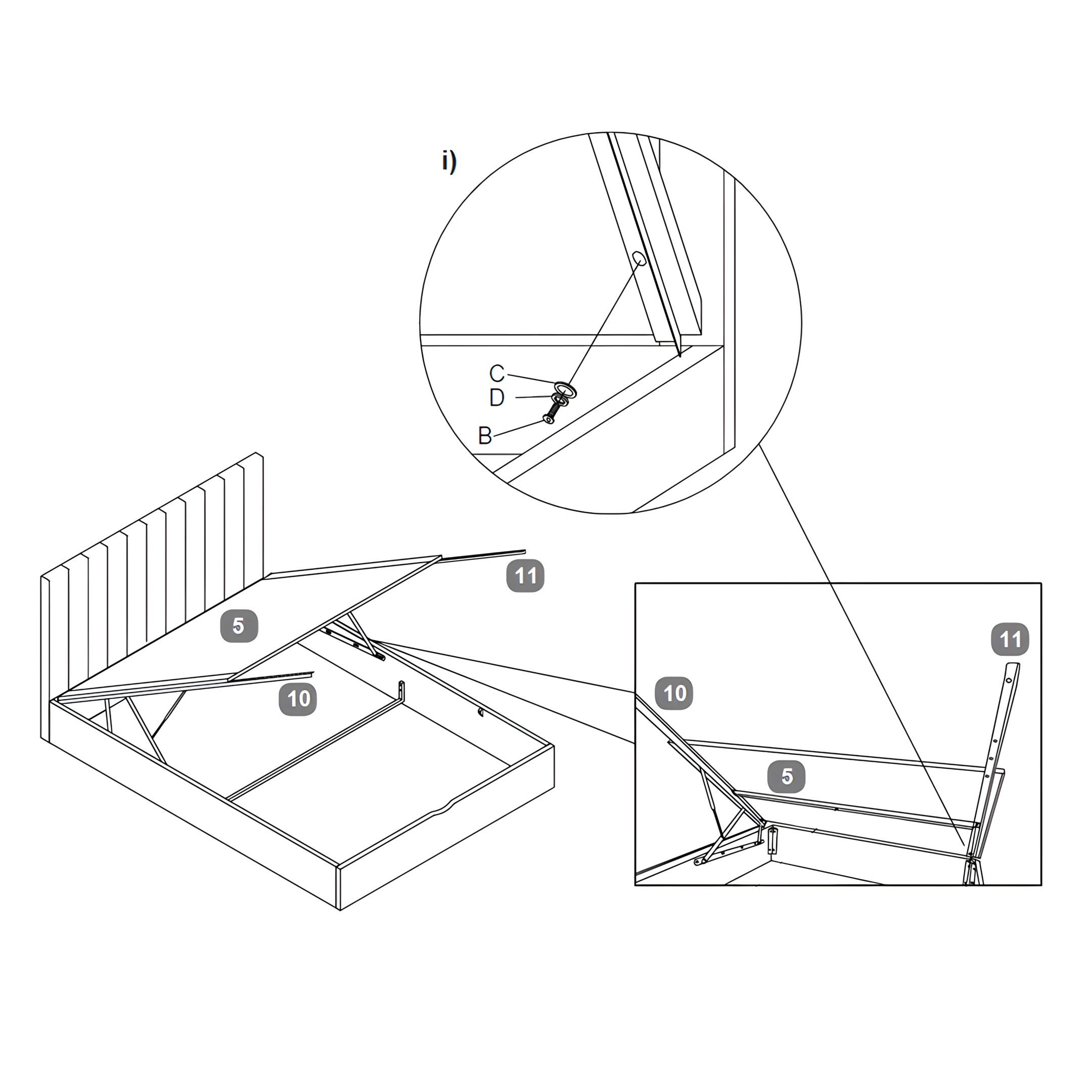 Secure the Mattress Base Boards to the Gas Lift Mechanisms using Bolts (B). For each bolt, first place a Spring Washer (D), then a Flat Washer (C) before tightening.