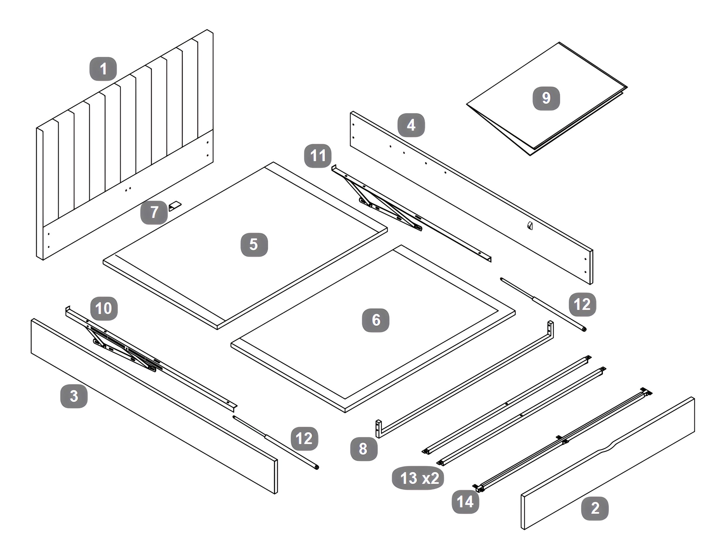 Position the Mattress Base Boards (5) onto the Gas Lift Mechanisms (10 & 11).