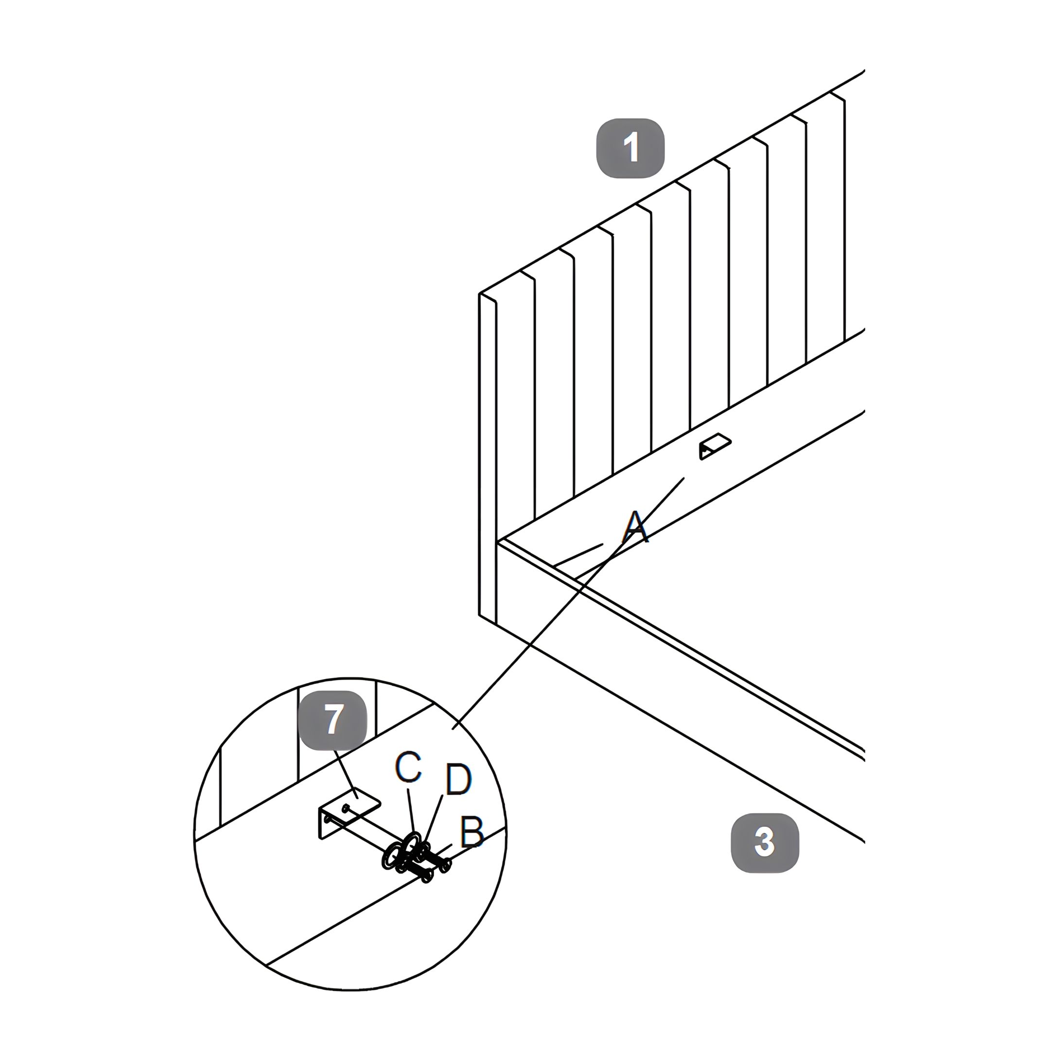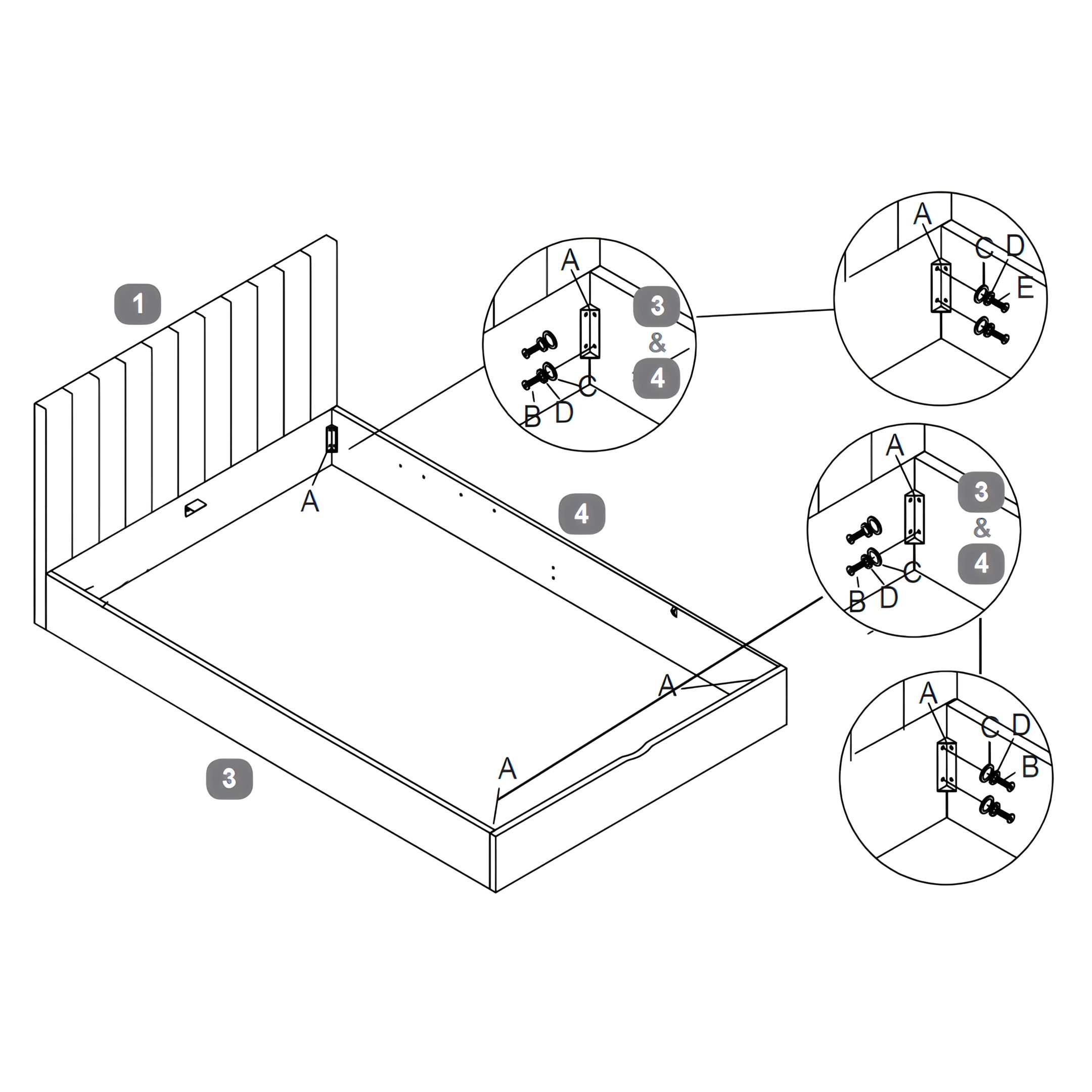 Secure each Side Rail to the Headboard and Footboard using Corner Brackets (A). For each bolt, first place a Flat Washer (C), then a Spring Washer (D), and finally insert and tighten the Bolt (B).