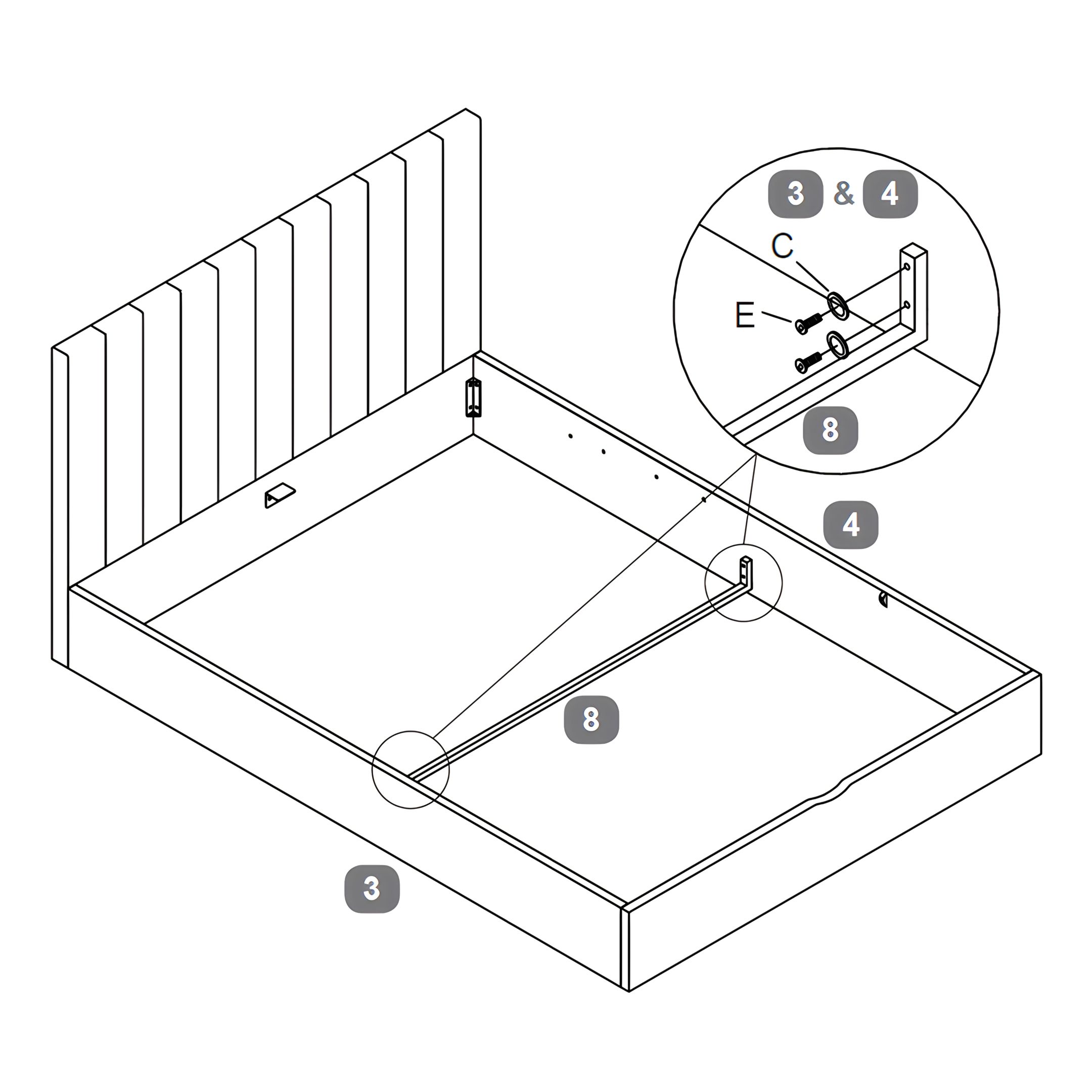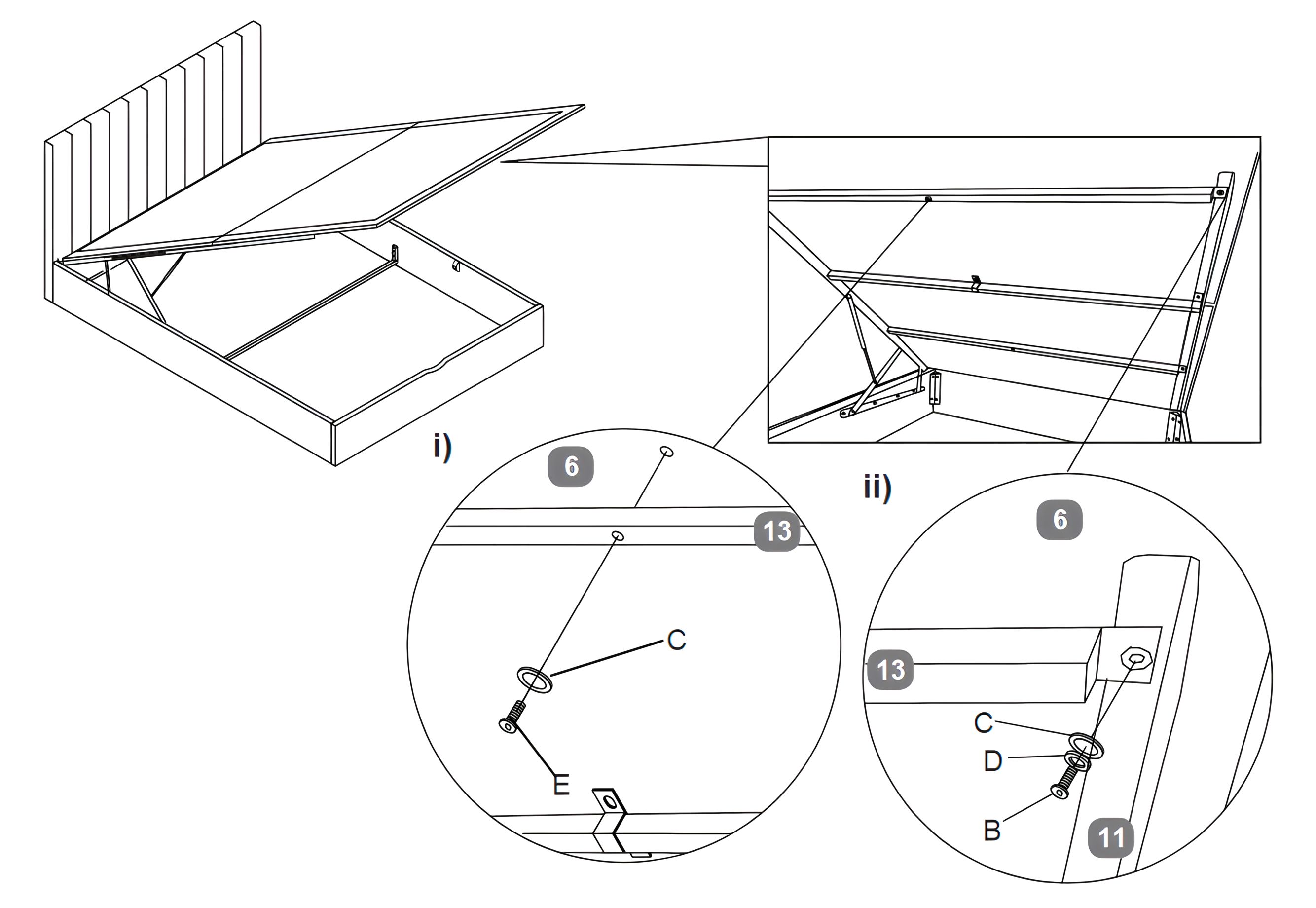 Attach the Support Rail for Mattress (13) to the Mattress Base Board (6) using Bolts (E) and Flat Washers (C).